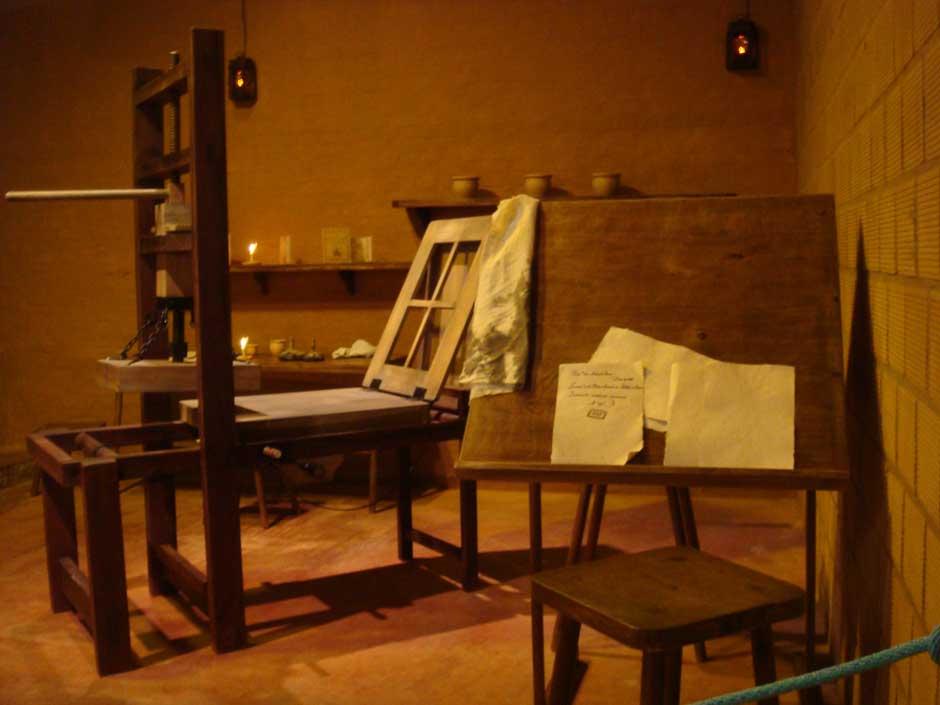 Sí. Un escritorio con estante, en donde se organizaban los tipos en familias. Sobre él están las “muñecas”, especies de almohadillas que servían para entintar los tipos. En esta mesa de trabajo se organizaban las cuartillas para coserlas y unirlas luego a la tapa protectora. Un escritorio doble, para el retoque de lo impreso con los otros colores de tintas. Hay estantes con vasijas de cerámica de las tintas de colores (desarrolladas en las misiones). Pueden verse papeles artesanales de talleres locales y 30 prácticas académicas. Los papeles, escasos e irregulares, representan la dificultad de su obtención, ya que estaba regulado por Europa, habiéndose prohibido su fabricación local.
